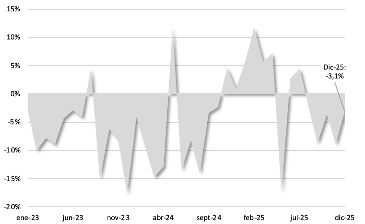 En diciembre, la recaudación volvió a mostrar un retroceso en términos reales, acumulando así el quinto mes consecutivo de caída. En la comparación interanual registró una baja del 3,1%, un desempeño que continúa parcialmente distorsionado por la elevada base de comparación de fines de 2024, pero que confirma que la dinámica de los ingresos fiscales sigue sin consolidar una recuperación sostenida. Aquel período había concentrado ingresos excepcionales vinculados a la regularización de activos, moratorias y anticipos impositivos, además del aporte del Impuesto PAIS (hoy eliminado) y de un esquema de derechos de exportación más exigente que el vigente en la actualidad.