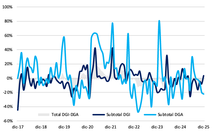 A nivel mensual, la dinámica de la recaudación continuó reflejando el impacto de estos factores heredados, aunque comenzaron a observarse algunas señales incipientes de estabilización en determinados tributos. En este marco, la Dirección General Impositiva (DGI) logró finalizar diciembre con un crecimiento real del 3,6% interanual, cortando una racha negativa de siete meses consecutivos.