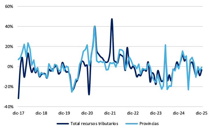 Finalmente, las transferencias automáticas a las provincias moderaron su ritmo de caída y se contrajeron apenas 0,5% real interanual, consolidando un desempeño heterogéneo, aunque con una tendencia más favorable a lo largo de 2025.