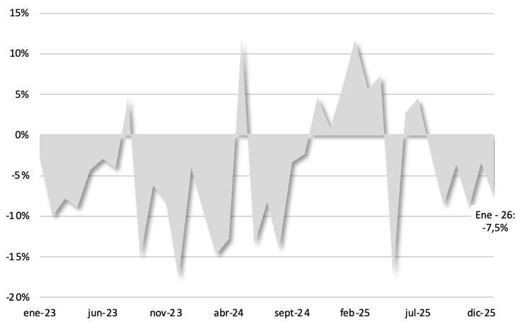En contraste con el desempeño prácticamente neutro de la DGI, la recaudación vinculada a la DGA registró en enero una fuerte contracción real interanual del 30,8%, consolidando un panorama ampliamente negativo en los tributos asociados al comercio exterior. Al interior, el retroceso fue generalizado, tanto en el IVA (-30,0%) como en Ganancias (-40,4%), reflejando una menor dinámica de las operaciones externas.