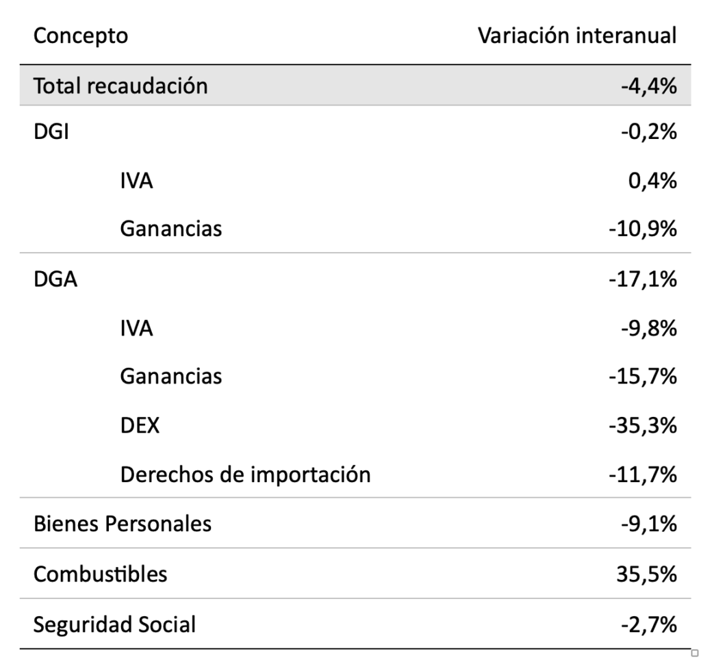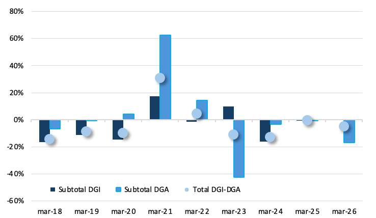 En este contexto, la recaudación asociada a la DGI se mantuvo prácticamente estable en marzo, con una variación real interanual de -0,2%. Al interior, los principales tributos mostraron un comportamiento homogéneamente débil, con Ganancias e IVA (que en conjunto explican más del 70% de la recaudación) exhibiendo caídas o desempeños neutros.