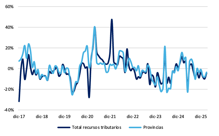 Por su parte, el IVA interrumpió la dinámica contractiva de los últimos meses y mostró una variación prácticamente neutra (0,4% real interanual). No obstante, su desempeño continuó condicionado por un mayor uso de planes de pago sobre deuda corriente y por mayores devoluciones en el marco del régimen de comercialización de granos.