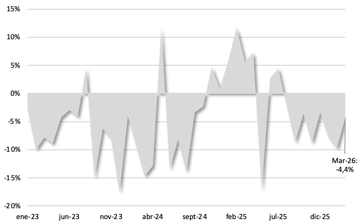 En contraste, la recaudación vinculada a la DGA registró una caída real interanual del 17,1%. Si bien se observó cierta moderación respecto de febrero (-37,5%), favorecida por contar con dos días hábiles adicionales, el conjunto de tributos asociados al comercio exterior continúa exhibiendo una dinámica marcadamente contractiva, en línea con la caída en las cantidades operadas. Al interior, el retroceso fue generalizado, tanto en el IVA (-9,8%) como en Ganancias (-15,7%).