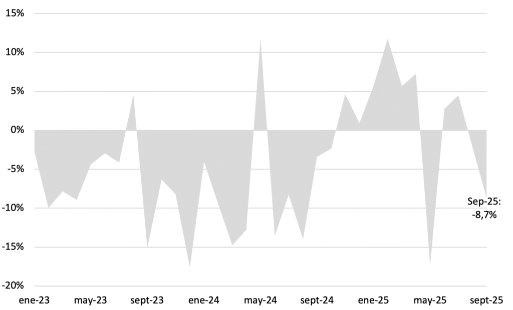 En septiembre, la recaudación cayó un 8,7% real interanual, principalmente por la elevada base de comparación que dejó septiembre 2024, cuando se registraron ingresos extraordinarios asociados a la regularización de bienes.