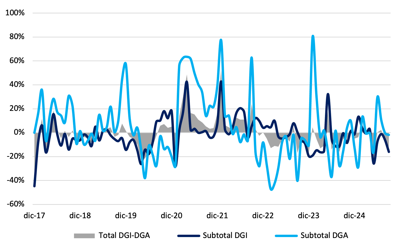 Gráfico nro. 2. Evolución de la recaudación DGI y DGA en términos reales, variaciones interanuales.