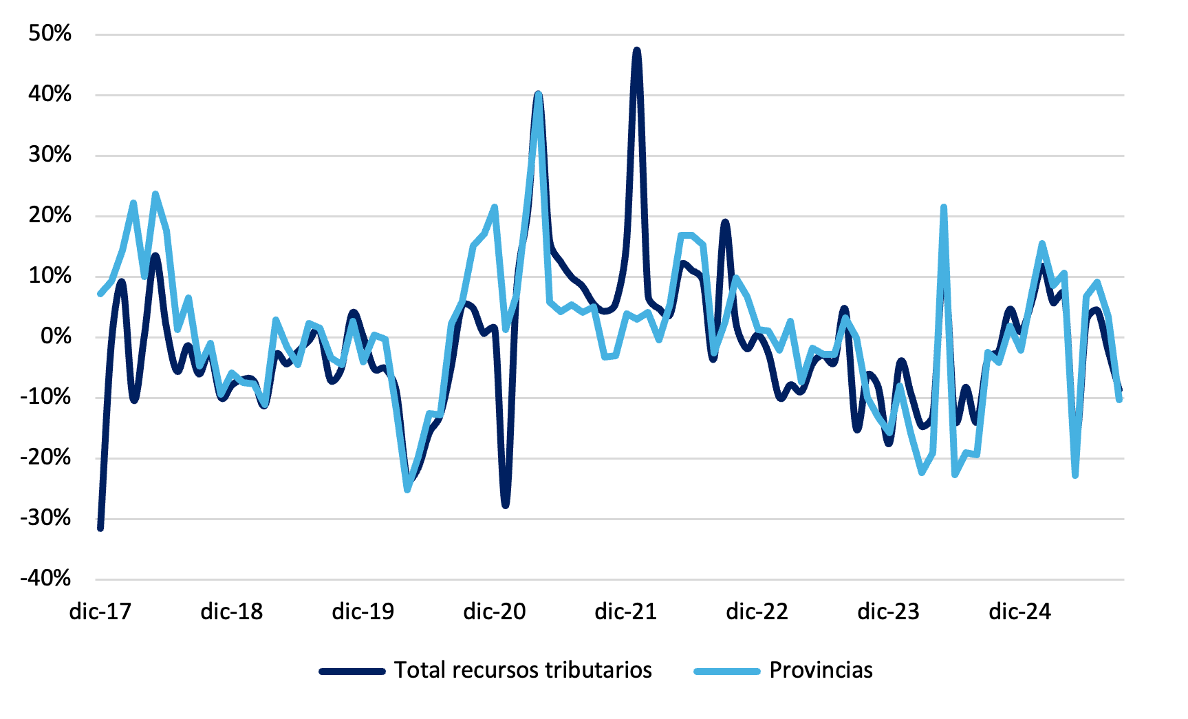 Gráfico nro. 1. Evolución de la recaudación tributaria en términos reales, variaciones interanuales.