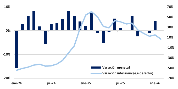Por su parte, los plazos fijos en pesos se mantuvieron prácticamente neutros en términos reales durante el mes. En la comparación interanual, el stock muestra una expansión del 7%, aunque moderándose respecto de los máximos observados en 2025. En línea con este comportamiento, el M3 privado registró en febrero una contracción real mensual del 1,9%.