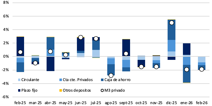 El M3 privado registró en febrero una caída del 1,9% en términos reales. En la comparación interanual, el agregado aumentó un 1,1%. Si bien todos rubros presentaron caídas, la contracción estuvo traccionada por el circulante y las cajas de ahorro. que aportaron 0,9 p.p., y 0,7 p.p respectivamente.