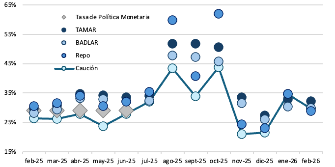 Las tasas se contrajeron en febrero como respuesta a menores exigencias de liquidez. Tanto las tasas de depósitos (TAMAR y BADLAR) como las tasas de corto plazo (caución y repo) disminuyeron, aunqe en esta últimas la variación mensual fue mas pronunciada; presentando disminuciones en el orden del 6% y 5% respectivamente.