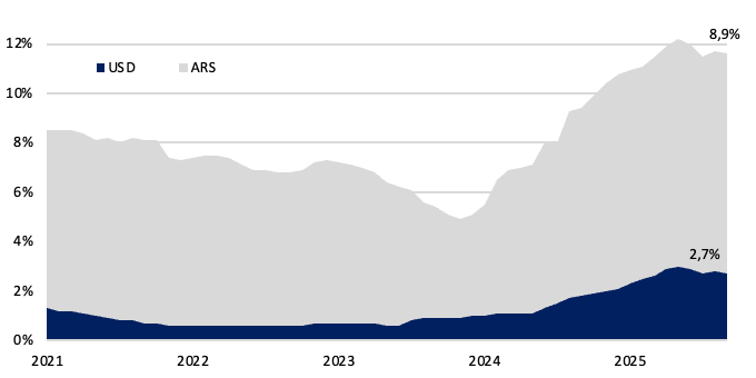 En cuanto al crédito, el financiamiento al sector privado en pesos se ubicó en torno al 8,9% del PIB, manteniéndose relativamente estable respecto del mes previo y consolidando el crecimiento observado desde comienzos de 2024. Dentro de su composición, se observó una caída mensual de los préstamos al consumo y comerciales, mientras que los préstamos hipotecarios fueron los únicos que registraron un incremento en el período. Por su parte, el crédito en dólares continuó expandiéndose y se ubicó en torno al 2,7% del PIB.
