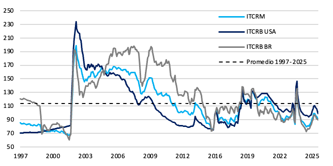 El ITCRM continuó apreciandose en febrero, alejandose levemente del promedio histórico. Tras el overshooting de enero-24, registró meses de apreciación que se revirtieron desde marzo-25. Durante el primer bimestre del año se apreció un 4,5%. En paralelo, los ITCRB con Brasil y EE.UU. acompañan con una trayectoria similar.