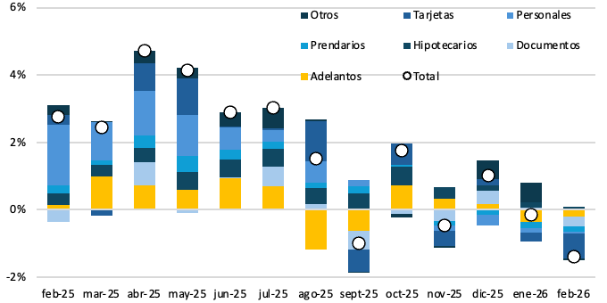 El crédito en pesos al sector privado se contrajo un 1,4% real en febrero. En términos interanuales, se ubicó en 20%, moderándose respecto al pico registrado en abril del año previo. El aumento nominal fue de ARS 1,1 billón, los préstamos al consumo junto con los comerciales fueron los de mayor incidencia en la caída -0,7 p.p. y -0,3 p.p respectivamente, por otro lado, los préstamos fueron los únicos que se ubicaron en terreno positivo con un incremento de 0,1 p.p.