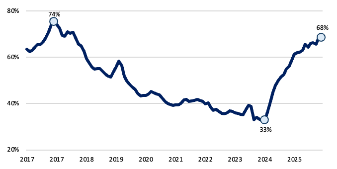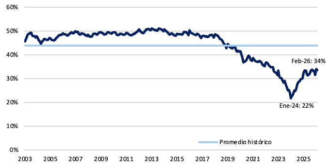 En febrero, el ratio de préstamos sobre depósitos en pesos constantes se ubicó en 68%, manteniéndose en niveles elevados luego de tocar mínimos en marzo de 2024 (33%). Sin embargo, aún se ubica por debajo de los máximos observados en 2017. Esto sugiere que, existe espacio para que el crédito continúe ganando participación dentro del sistema financiero.