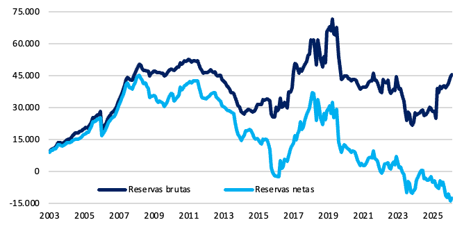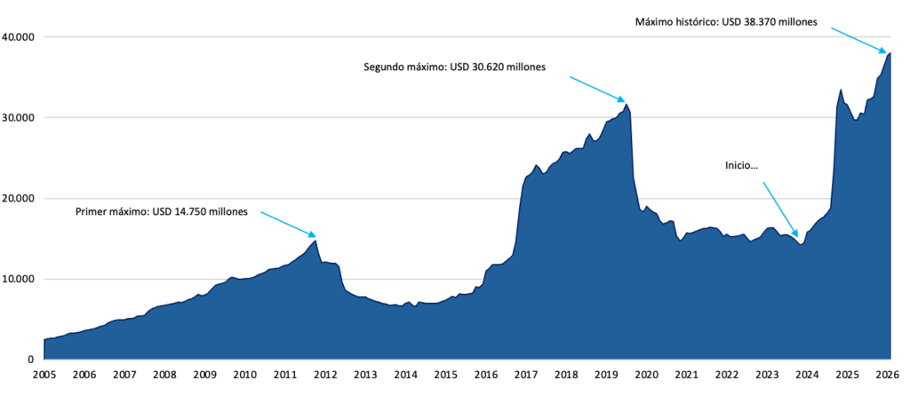 En perspectiva histórica, el nivel actual supera ampliamente los picos previos observados en 2011 (USD 14.750 millones) y en 2019 (USD 30.620 millones).