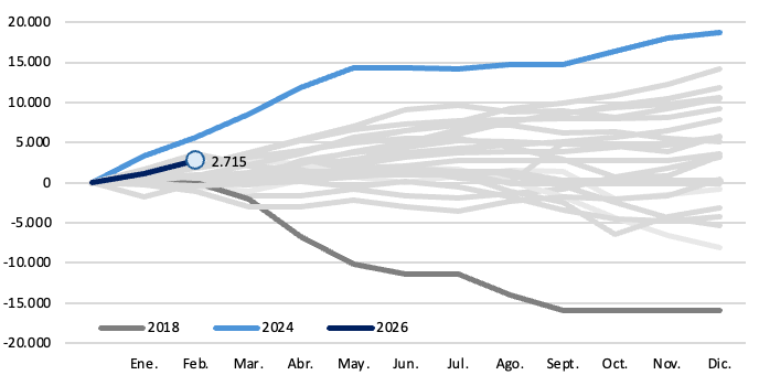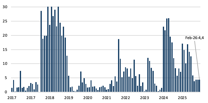 Desde enero, el BCRA puso en marcha la nueva fase de re-monetización del programa monetario, que incorpora un esquema de bandas cambiarias con ajustes mensuales en función de la inflación (IPC T-1). En este marco, la autoridad monetaria retomó activamente las compras de divisas en el mercado oficial, acumulando USD 1.557 millones durante el segundo mes del año.