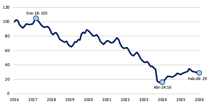 La relación entre el circulante y los depósitos a la vista se ubicó en 34%. Si bien se observa cierto estancamiento, se mantiene por encima del piso registrado en enero de 2024, aunque aún muy por debajo del promedio histórico, que se ubica en 45%.