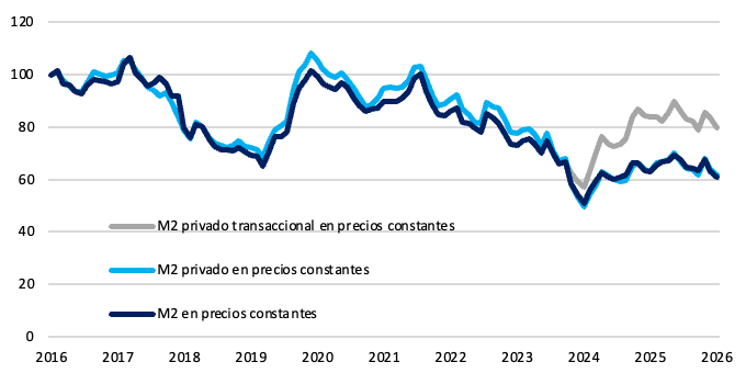 En febrero, el M2 se contrajo ARS 0,8 billones en términos nominales. En la misma línea se ubicó el M2 privado transaccional que cayó un 4,2% real. En cuanto al M2 privado, disminuyó un 3,5% real con respecto al mes previo.