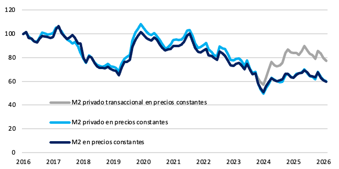 En línea con esta dinámica, los agregados transaccionales registraron nuevas caídas en términos reales. El M2 mostró una expansión nominal de ARS 0,8 billones que no logró compensar la dinámica de precios, lo que se tradujo en una caída real del 1,9%. En la misma línea, el M2 privado transaccional se contrajo un 3% real, mientras que el M2 privado disminuyó un 2,4% respecto al mes previo.