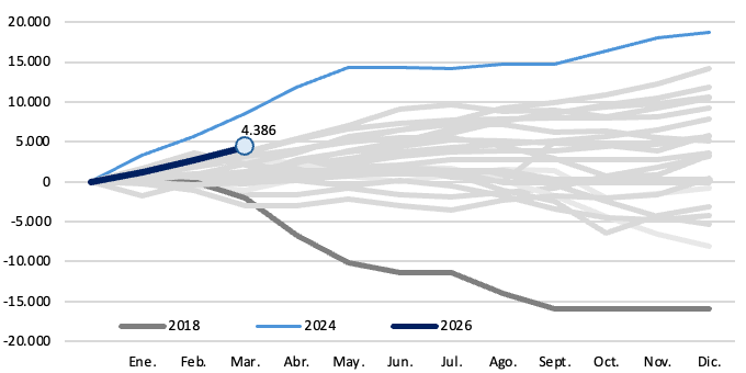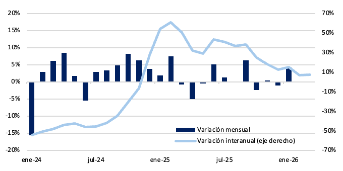 Por su parte, los depósitos a plazo fijo en pesos se mantuvieron prácticamente neutros en términos reales durante marzo. En la comparación interanual, continúan creciendo en torno al 7,5%, aunque con una moderación respecto a los máximos observados durante 2025, reflejando una desaceleración en la expansión del stock y una mayor volatilidad en los flujos mensuales.