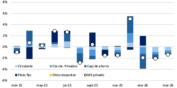 El M3 privado registró en marzo una caída del 1,4% en términos reales. En la comparación interanual, el agregado aumentó un 0,5%. Si bien todos rubros presentaron caídas, la contracción estuvo traccionada por el circulante y las cuentas corrientes. que aportaron 0,6 p.p., y 0,4 p.p respectivamente.