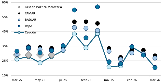 Las tasas continuaron descendiendo en marzo como puesta a menores exigencias de liquidez. Tanto las tasas de depósitos (TAMAR y BADLAR) como las tasas de corto plazo (caución y repo) disminuyeron, aunque en esta últimas la variación mensual fue mas pronunciada; presentando disminuciones en el orden del 9% y 8,5% respectivamente.