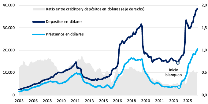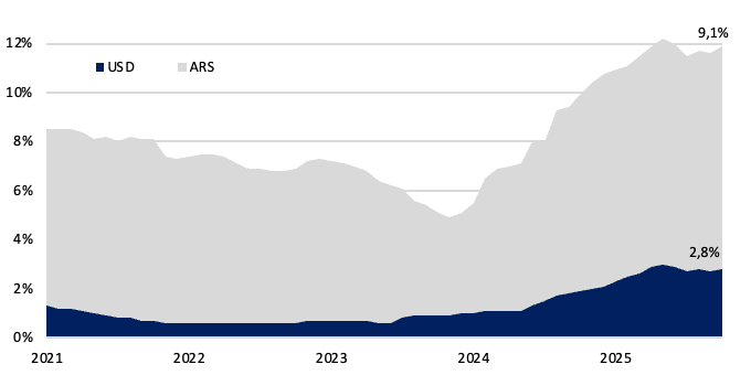 En el frente en moneda extranjera, los depósitos del sector privado continuaron expandiéndose y alcanzaron nuevos máximos históricos, consolidando la tendencia creciente observada en los últimos meses. En paralelo, el crédito en dólares también mantuvo su trayectoria ascendente, acompañando la mayor disponibilidad de fondeo en moneda extranjera dentro del sistema financiero.