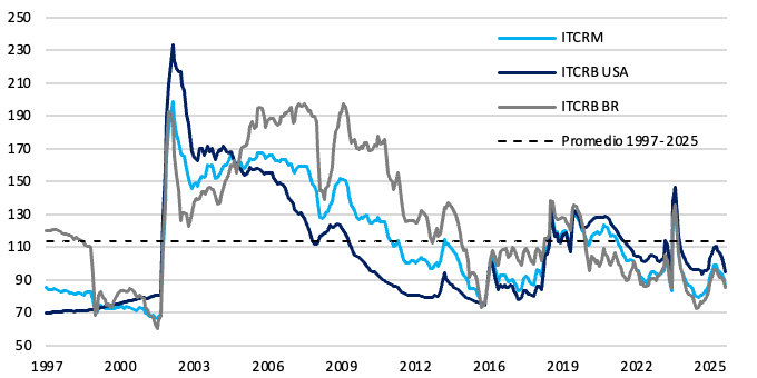 El ITCRM continuó apreciandose en marzo (4,2%), alejandose del promedio histórico. Durante el primer trimestre del año se apreció un 8,9%. En paralelo, los ITCRB con Brasil y EE.UU. acompañan con una trayectoria similar.