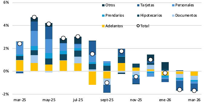 El crédito en pesos al sector privado se contrajo un 1,7% real en marzo. En términos interanuales, se ubicó en 15%, moderándose respecto al pico registrado en abril del año previo. El aumento nominal fue de ARS 1,1 billón, los préstamos al consumo junto con los comerciales fueron los de mayor incidencia en la caída 0,6 p.p. y 0,4 p.p respectivamente, por otro lado, los préstamos hipotecarios fueron los únicos que se ubicaron en terreno positivo con un incremento de 0,1 p.p.