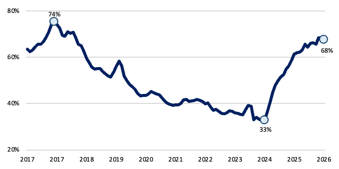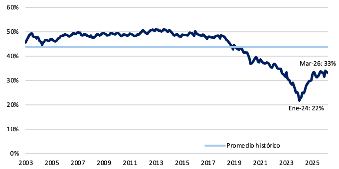 En marzo, el ratio de préstamos sobre depósitos en pesos constantes se ubicó en 68%, manteniéndose en niveles elevados luego de tocar mínimos en marzo de 2024 (33%). Sin embargo, aún se ubica por debajo de los máximos observados en 2017. Esto sugiere que, existe espacio para que el crédito continúe ganando participación dentro del sistema financiero.