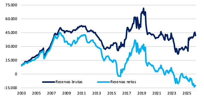 Gráfico nro. 15: Reservas brutas y netas (fin de mes, en dólares en millones de dólares)