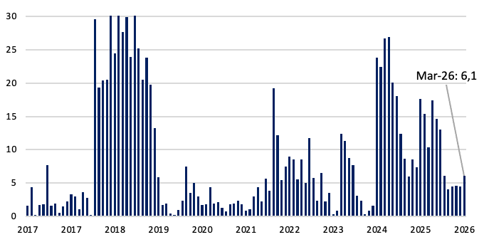 En marzo, los plazos fijos en pesos se mantuvieron neutros en términos reales. En la comparación interanual crecieron en torno al 7,5%, moderándose frente a los máximos observados en 2025. La dinámica refleja una moderación en la expansión del stock y una mayor volatilidad en los flujos mensuales.