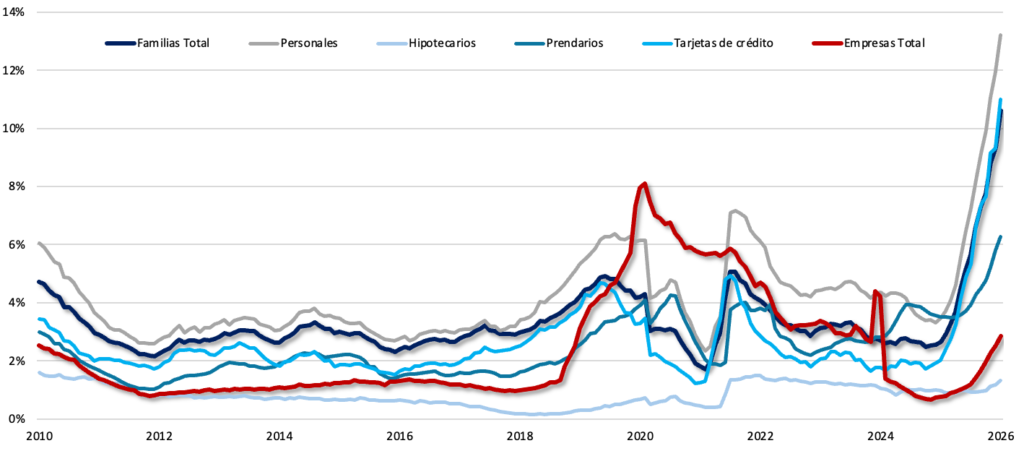 La irregularidad del crédito al sector privado continúa en aumento y alcanza niveles máximos en términos históricos, con una aceleración marcada desde comienzos de 2025. Durante los últimos meses, el deterioro se concentró principalmente en las líneas de financiamiento a familias, donde los préstamos personales y a tarjetas de crédito exhibieron subas sostenidas y alcanzaron los valores más elevados de la serie. En particular, los préstamos personales pasaron de un 3,3% en marzo de 2025 a niveles del 13,2% en la actualidad, acumulando un incremento de 9,1 puntos porcentuales en el período. En la misma línea, la mora en tarjetas de crédito mostró una trayectoria ascendente desde inicios de 2025. Como resultado, el ratio de irregularidad total de familias se ubicó en máximos históricos. Por su parte, el segmento de empresas también presenta una dinámica creciente, aunque de menor magnitud.