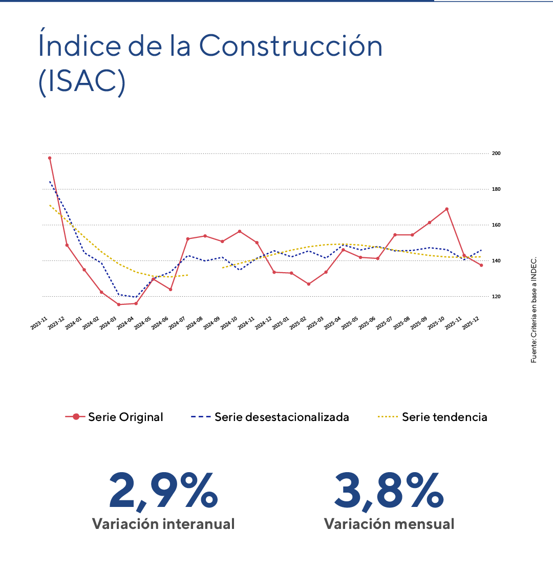 En diciembre, el Indicador Sintético de la Actividad de la Construcción (ISAC), en su serie desestacionalizada se expandió 3,8% mensual, y registró una suba interanual del 2,9%. En el acumulado de los doce meses de 2025 la actividad muestra una expansión del 6,3% respecto de igual período de 2024.