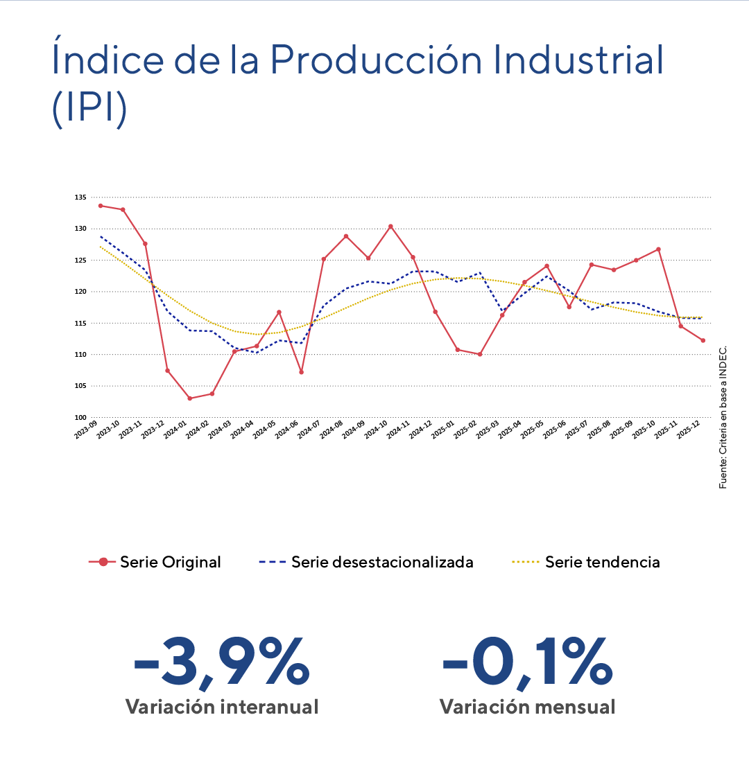 En diciembre, el Índice de Producción Industrial (IPI), en términos desestacionalizados, cayó 0,1% mensual y mostró una contracción interanual del 3,9%. En el acumulado del 2025, la actividad industrial registra un avance del 1,6% respecto de igual período de 2024.