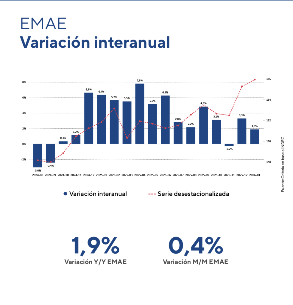 En enero, el EMAE registró un crecimiento de 0,4% mensual desestacionalizado y una suba interanual de 1,9%. Con este resultado, el nivel de actividad volvió a ubicarse en máximos históricos en términos desestacionalizados.