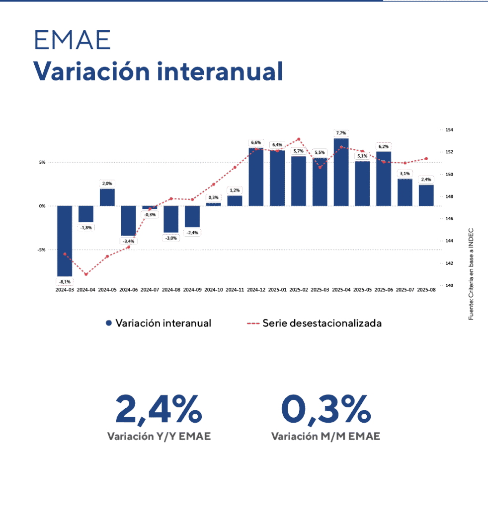 En agosto, el EMAE registró un incremento desestacionalizado de 0,3% respecto de julio y un crecimiento interanual de 2,4%, interrumpiendo tres meses consecutivos de caída. Sin embargo, la mejora se concentró en pocos sectores —principalmente intermediación financiera y minería— mientras que la industria y el comercio continuaron en retroceso.