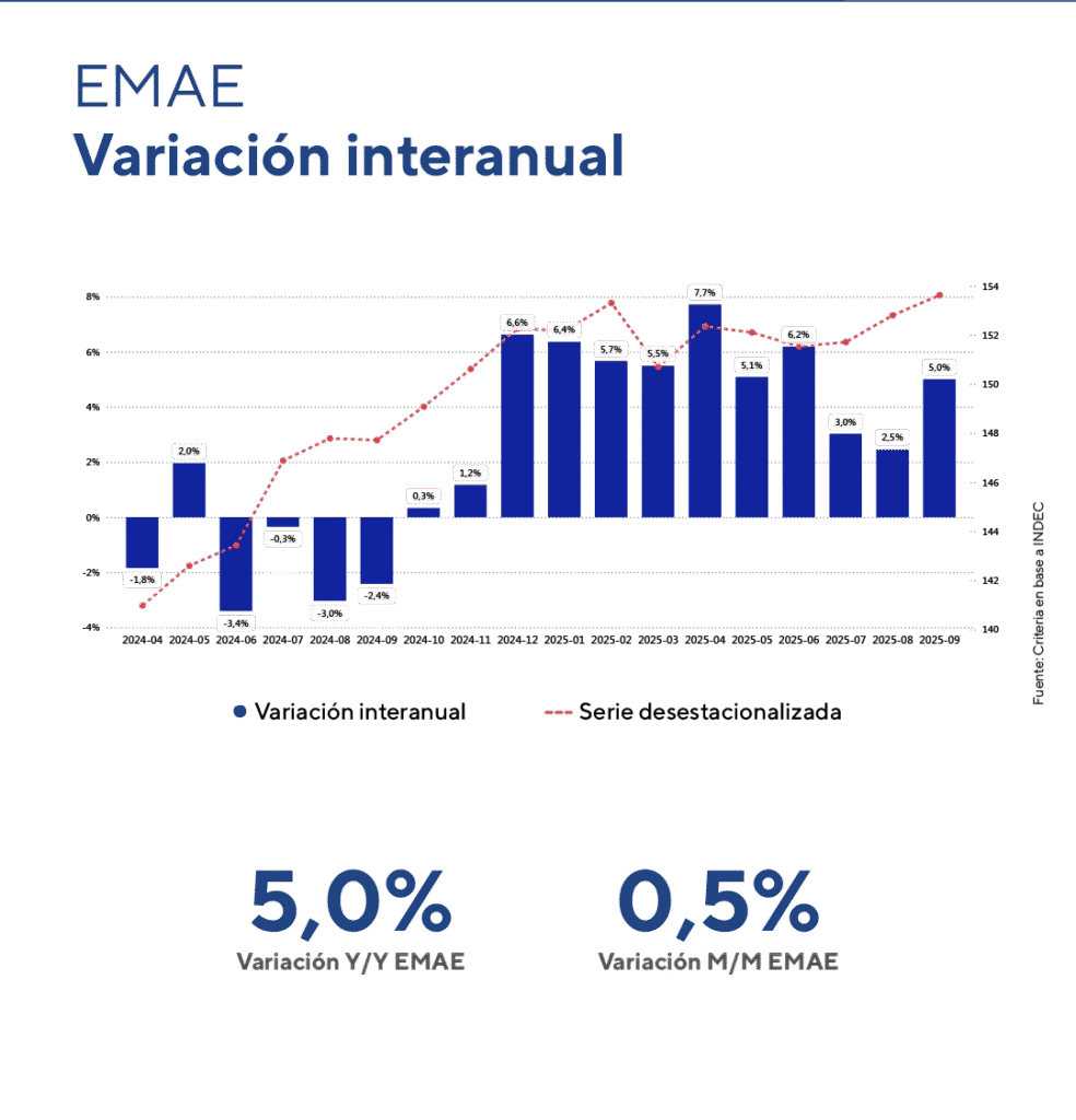 En septiembre, el Estimador Mensual de Actividad Económica (EMAE) registró una suba desestacionalizada de 0,5% respecto de agosto, mientras que en términos interanuales creció un 5,0%.