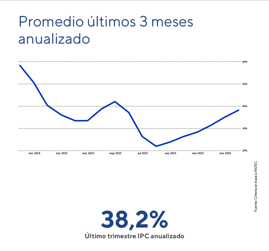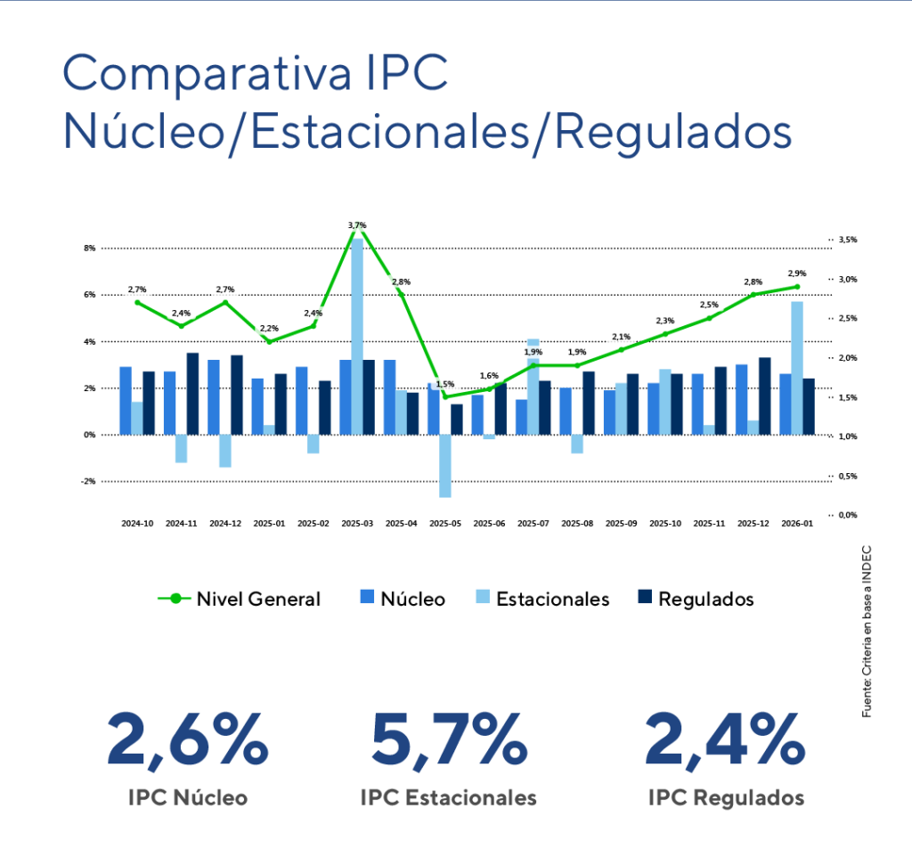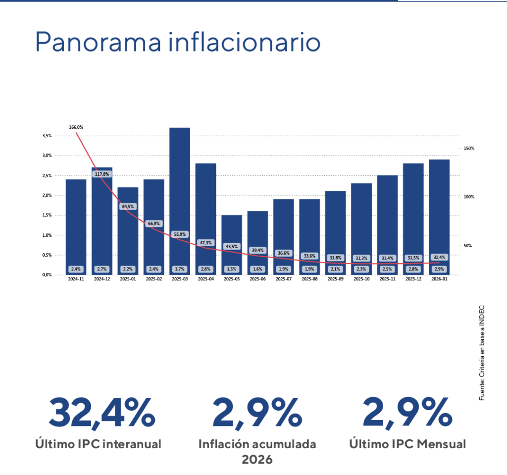 El IPC de enero se ubicó en 2,9% mensual, acelerándose 0,1 pp respecto de diciembre (+2,8%) y marcando el registro más alto desde marzo de 2025. En términos interanuales, el 32,4% interrumpió la trayectoria descendente observada en los últimos meses.