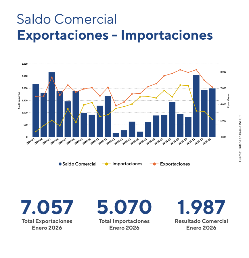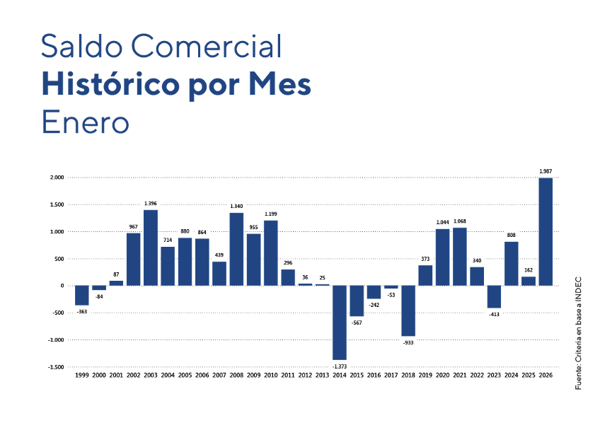 El saldo comercial fue superavitario en USD 1.987 millones, acumulando veintiséis meses consecutivos con resultado positivo y registrando el mejor desempeño para un mes de enero desde 1990. En comparación con diciembre, el superávit se amplió, consolidando la fortaleza del frente externo.