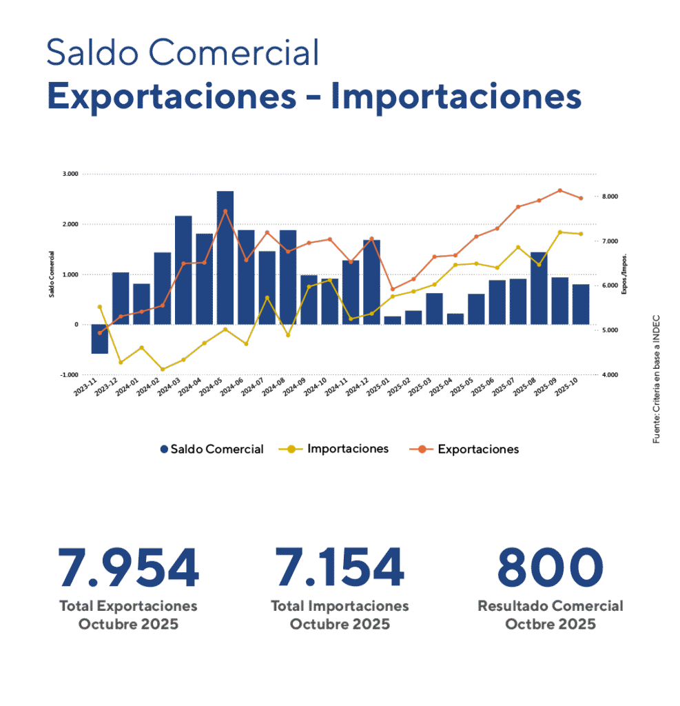 En octubre, las exportaciones totalizaron USD 7.954 millones, con un crecimiento interanual de 13,1%, mientras que las importaciones alcanzaron USD 7.154 millones, con un aumento de 16,9%. En términos desestacionalizados, las exportaciones retrocedieron 1,7% frente a septiembre y las importaciones 2,3%.