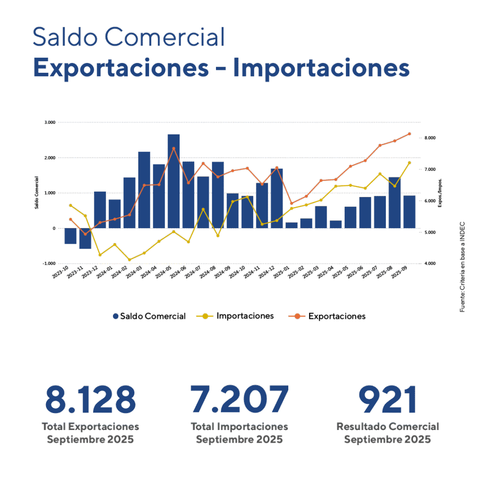 En el acumulado de los primeros nueve meses del año, las exportaciones sumaron USD 63.553 millones (+7,5%) y las importaciones USD 57.503 millones (+30,6%), arrojando un superávit de USD 6.050 millones, inferior a los USD 15.057 millones del mismo período de 2024. Excluyendo el sector energético, el superávit fue de solo USD 682 millones, frente a los USD 11.343 millones del mismo período de 2024, lo que refleja que el mayor dinamismo de las importaciones frente a las exportaciones se concentra en el resto de los sectores.