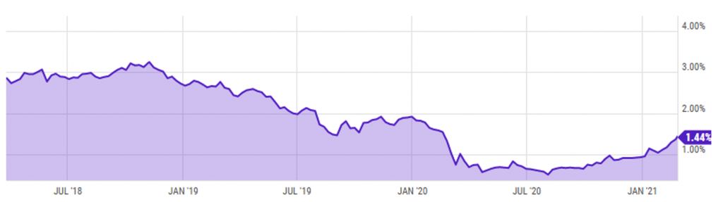 Desde niveles mínimos de 0,50% durante la pandemia, el rendimiento de los Treasuries a 10 años emprendió a comienzos de año un camino de suba. Este se aceleró sustancialmente en la última semana, estabilizándose finalmente en torno a 1,50%.