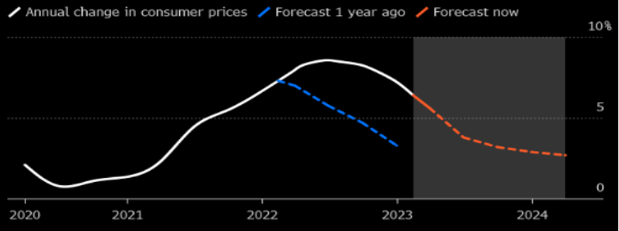 Inflación actual en Estados Unidos y estimación futura. (Azul: Estimación hace un año; Naranja: estimación hoy).
